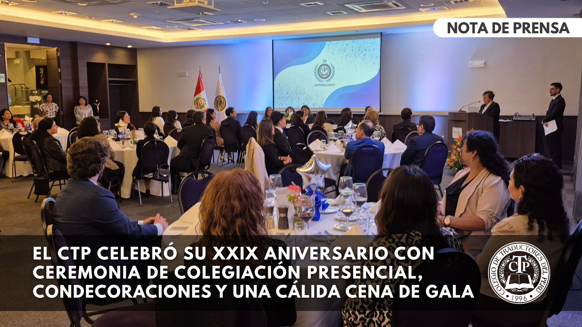 El viernes 14 de noviembre, el Colegio de Traductores del Perú conmemoró su 29.º aniversario institucional con una ceremonia especial que incluyó una colegiación grupal, la entrega de tres Medallas San Jerónimo, un reconocimiento especial a la Dra. Mary Ann Monteagudo y una acogedora cena de gala. La ceremonia tuvo lugar en el Hotel Novotel, sala Machu Picchu, en el