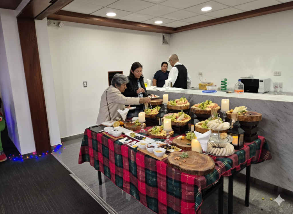 El encuentro se desarrolló en un ambiente de cercanía y camaradería, concebido como un espacio de reencuentro, celebración y reconocimiento al espíritu emprendedor de nuestros colegiados. Durante la velada, los asistentes compartieron un brindis navideño y disfrutaron de una cuidadosa propuesta gastronómica, que incluyó mesas de quesos con una variada selección de quesos nacionales e importados, acompañados de frutas secas, frutas frescas, galletas, panecillos y otros bocadillos, además de vino, creando un entorno acogedor y propicio para la conversación.