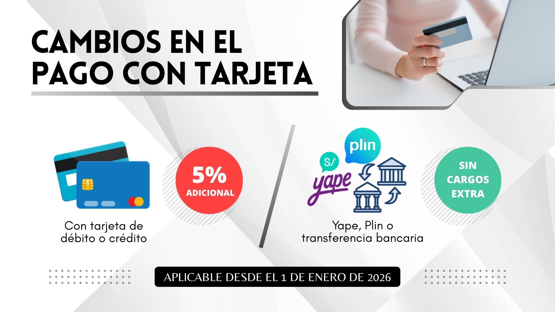Nuestros otros medios de pago, como transferencias bancarias, Yape y Plin, no aplican este cargo adicional y continúan siendo una alternativa segura y rápida para realizar sus pagos.