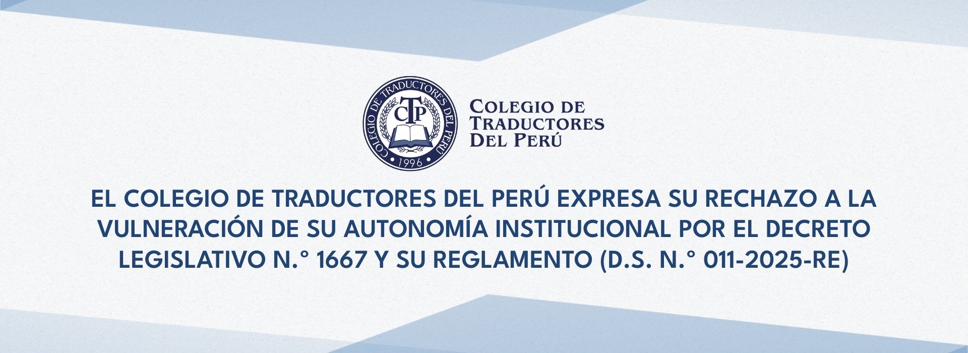 EL COLEGIO DE TRADUCTORES DEL PERÚ EXPRESA SU TOTAL RECHAZO A LA VULNERACIÓN DE SU AUTONOMÍA INSTITUCIONAL POR EL DECRETO LEGISLATIVO 1667 Y SU REGLAMENTO, APROBADO POR DECRETO SUPREMO 011-2025-RE, EN EL MARCO DEL PROCESO DE SELECCIÓN DE TRADUCTORES PÚBLICOS JURAMENTADOS QUE VIENE SIENDO EJECUTADO POR LA DIRECCIÓN GENERAL DE COMUNIDADES PERUANAS EN EL EXTERIOR Y ASUNTOS CONSULARES DEL MINISTERIO